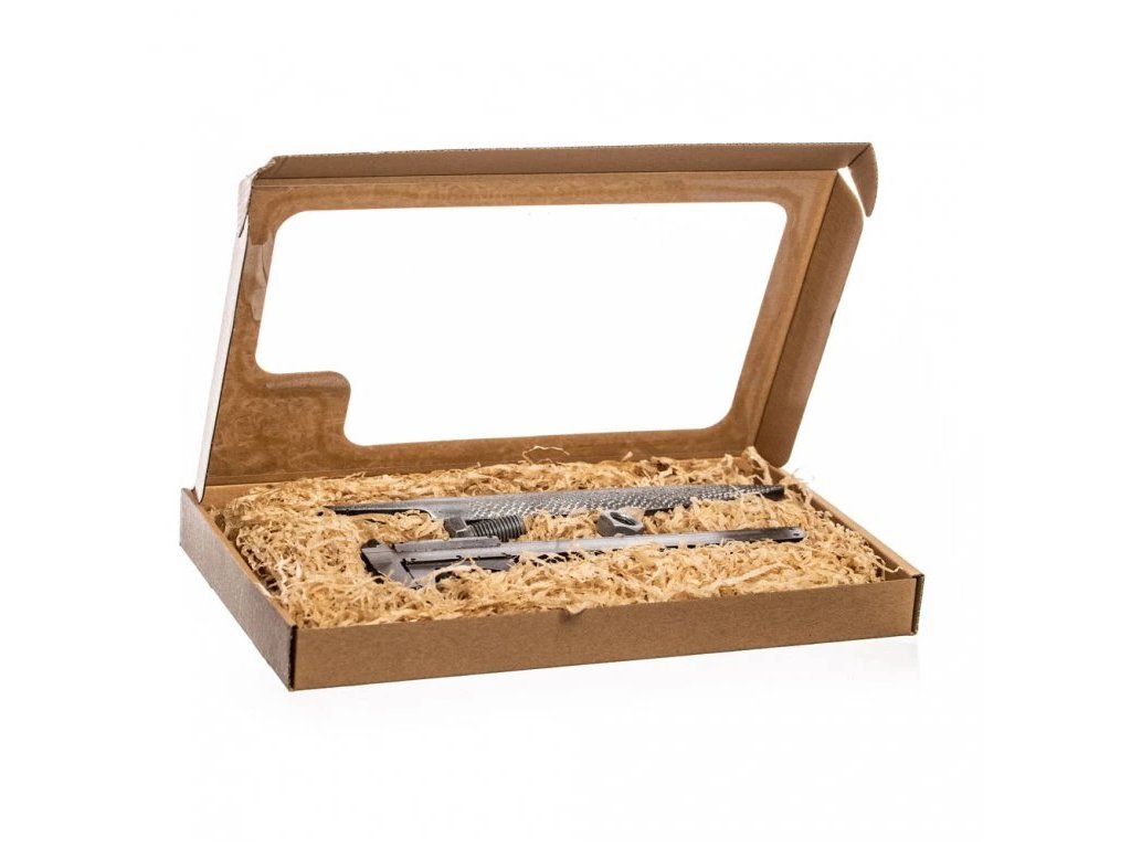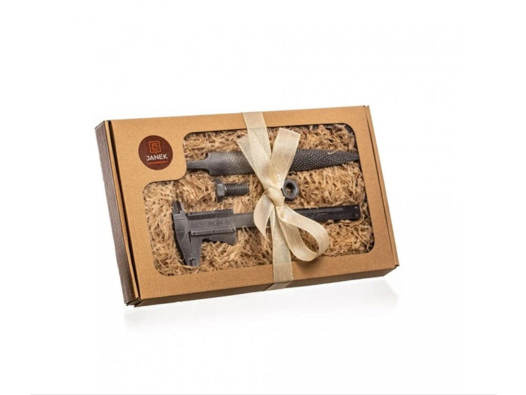 Čokoládové nářadí „pilník a šuplera“ je jedinečná sladká specialita vyrobená z prvotřídní 72% hořké čokolády, která potěší nejen milovníky čokolády, ale také každého kutila. Detailní provedení nástrojů vypadá jako skutečné kovové nářadí, díky čemuž je tento produkt skvělým a originálním dárkem k narozeninám, svátku, Vánocům či jako vtipné překvapení.